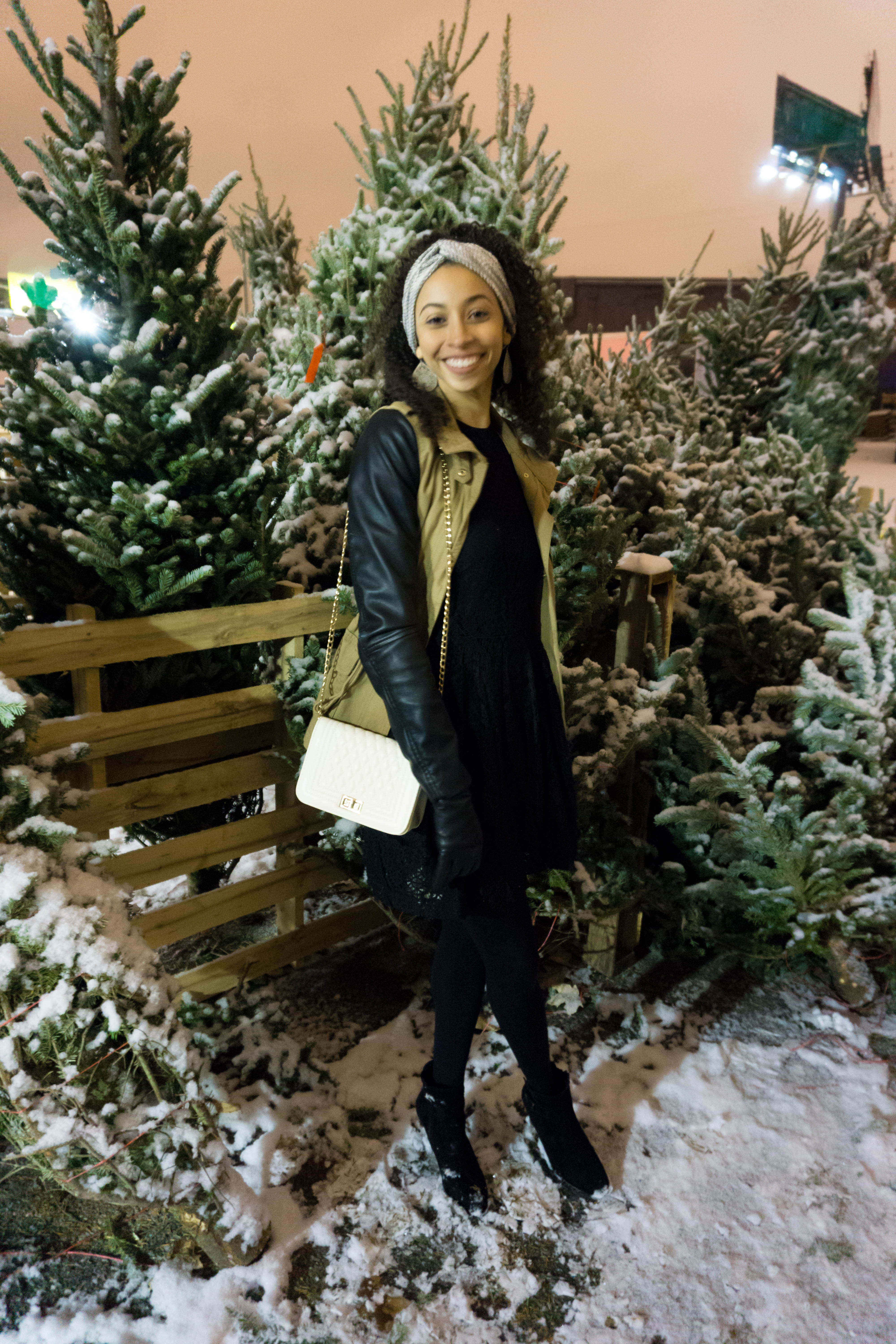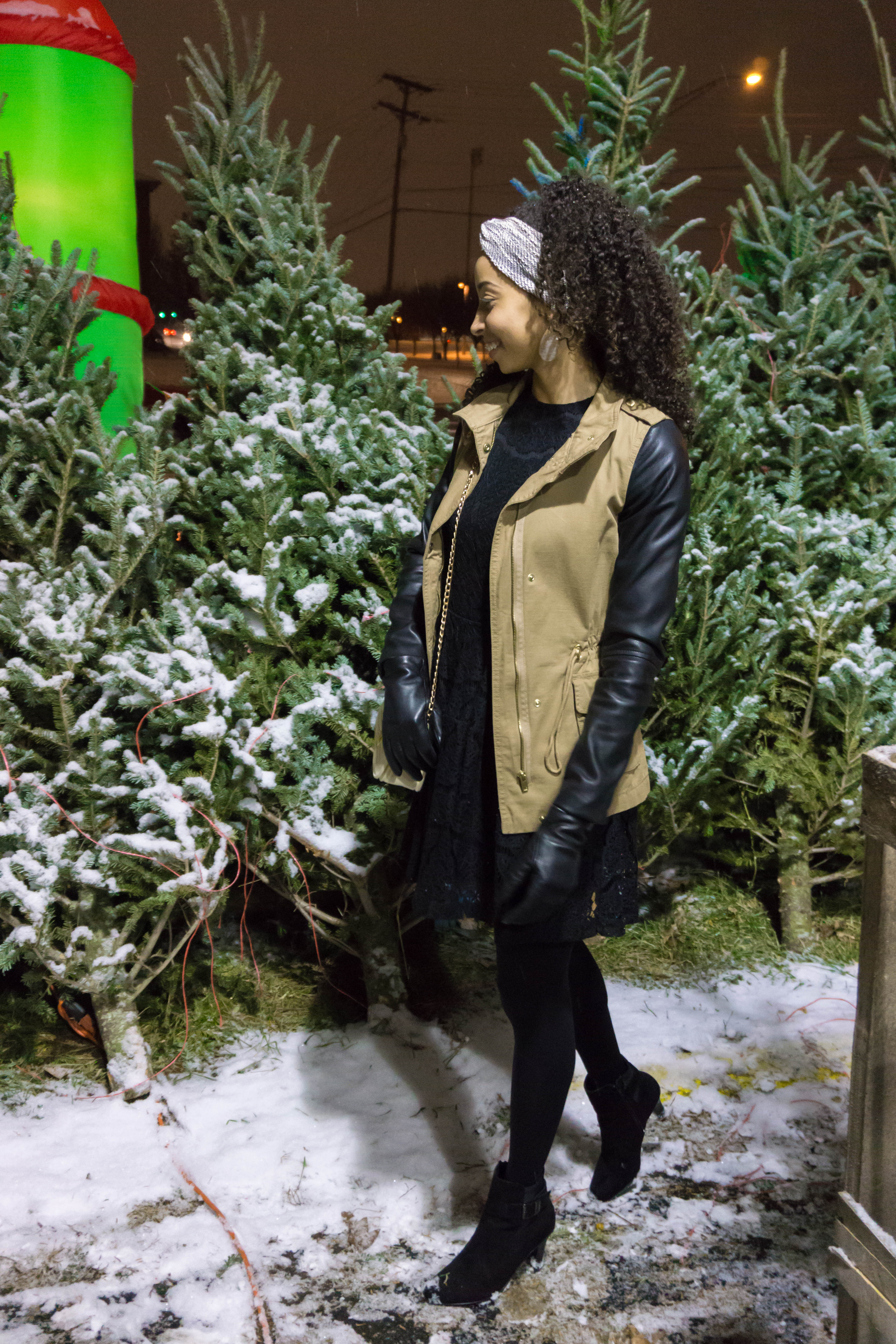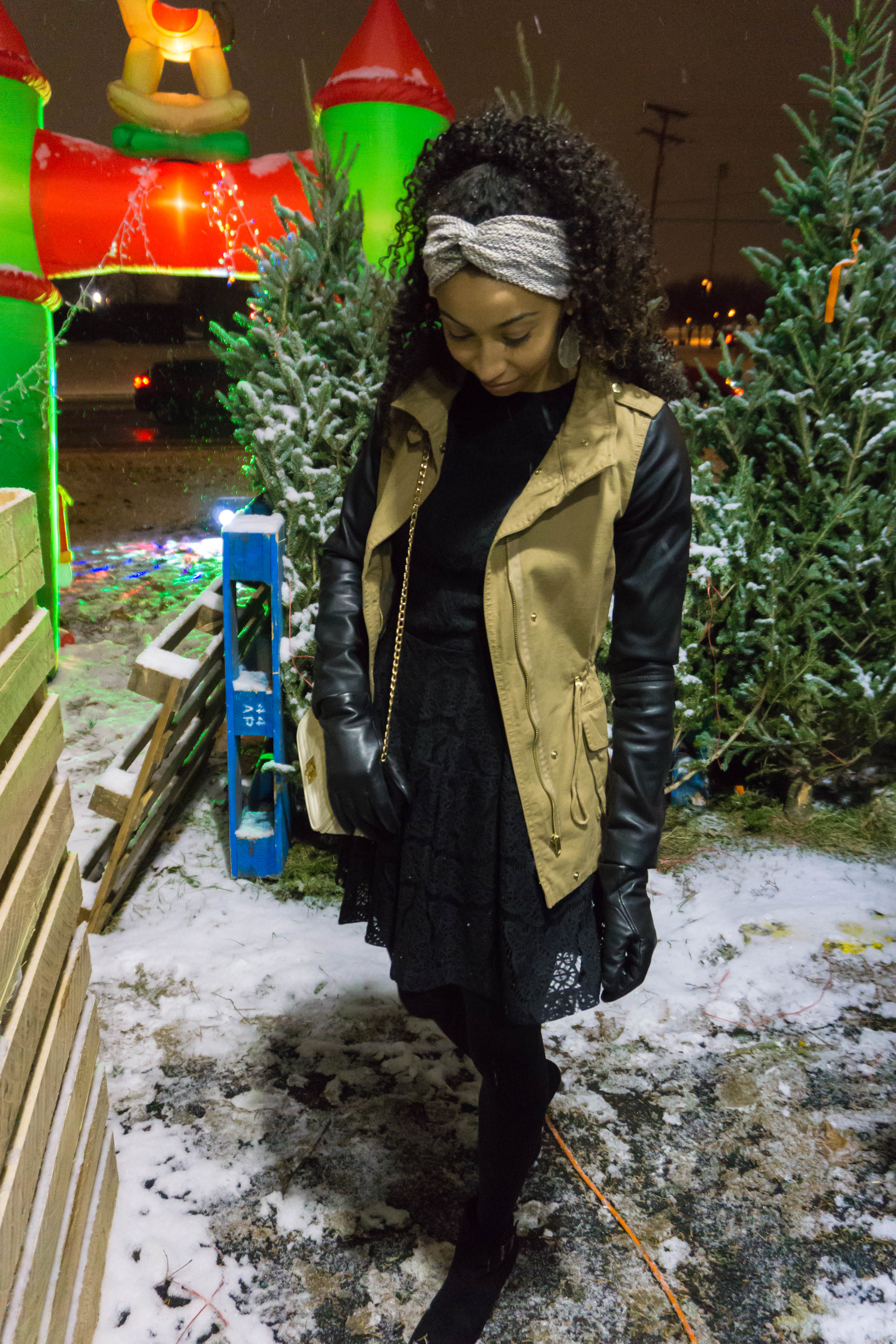 If you are going to be traveling to see family, or just going to a nice dinner, a great well tailored coat is the perfect way to elevate an outfit. Mine is from Forever 21 and I absolutely love the faux leather sleeves. Underneath is my Christmas party dress which is all black with black lace that give off Christmas but isn’t too in your face.